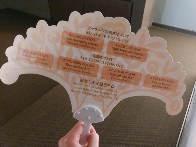 日本語・英語・タイ語で書いてある、施述中に使われるであろうフレーズを指差すことでマッサージ師さんとコミュニケーションできる「指差しうちわ」というもののようです。